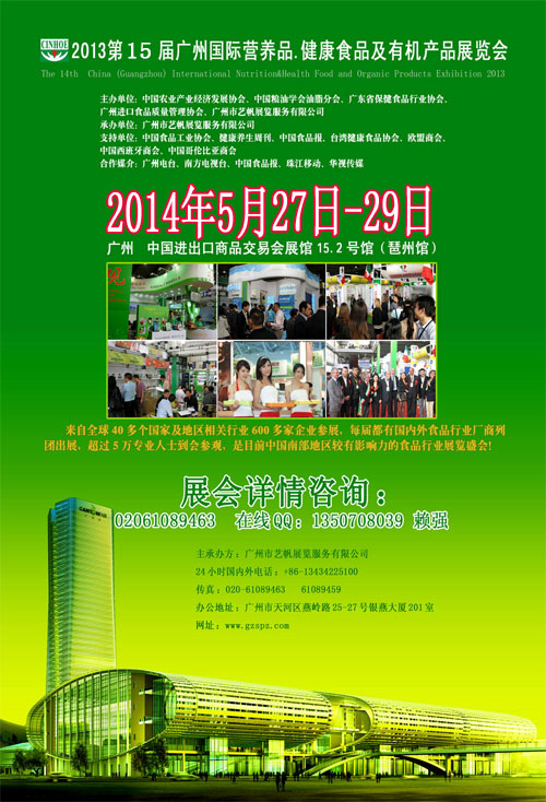 - 不久前[展會] 2014第15屆中國廣州國際營養(yǎng)品.健康食品及有機(jī)產(chǎn)品展覽會