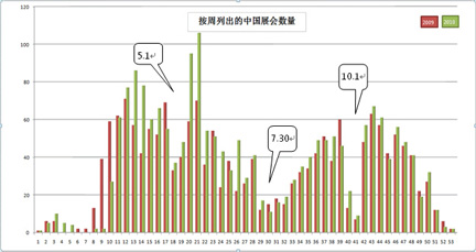 展會從自身數(shù)據(jù)庫中檢索了2009年、2010年的展會情況,把開展日期按周分組,得到了本圖。