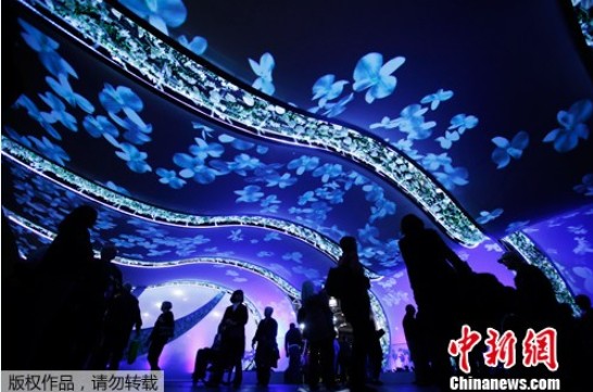 2012年3月5日,美國(guó)賓夕法尼亞州費(fèi)城會(huì)展中心舉行的2012年費(fèi)城國(guó)際花,游客在觀看瓦利福奇鮮花公司(Valley Forge Flowers)推出的視頻投影《波浪》(Wave)。
