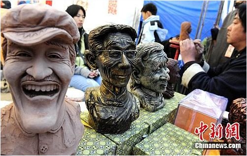 3月31日,觀眾在第三屆北京非物質(zhì)文化遺產(chǎn)博覽會現(xiàn)場體驗民間手工藝人泥塑藝術(shù)創(chuàng)作。展臺前其創(chuàng)作的著名相聲大師馬三立、著名表演藝術(shù)家趙本山等名家泥塑像,吸引參觀者駐足。