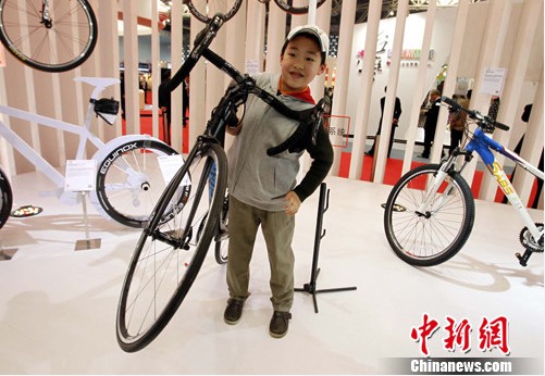 4月5日,2012上海臺灣名品博覽會上海世博展覽館開幕,其中“臺灣精品館”10項創(chuàng)新產(chǎn)品擁有全球第一殊榮,成為各界矚目焦點(diǎn)。圖為用碳纖維制作的全世界最輕的自行車,僅六點(diǎn)七公斤,兒童也能輕易提起。(來源:中新網(wǎng))