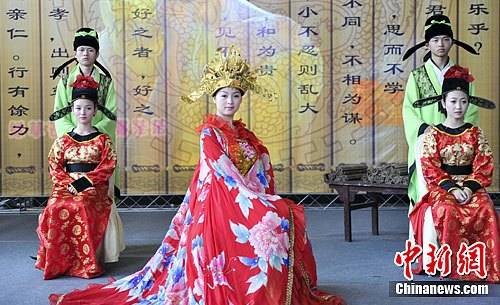 4月24日,古裝美女在中國(濟南)國際演出交易會暨演藝裝備場所設施展覽會上向觀眾推介演藝項目。當日開幕的該展會有200多家國內知名演出公司、演藝裝備場所設施企業(yè)向參觀者推介演藝項目、展示演出設施設備。(來源:中新網)