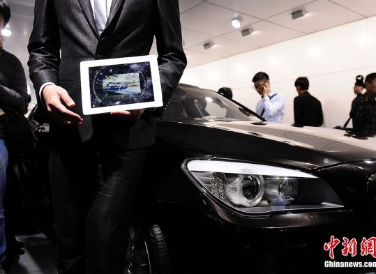 4月26日,2012(第十二屆)北京國際車繼續(xù)舉行。在不少廠商展臺,導(dǎo)購人員或模特均手持iPad等平板電腦,作為向觀眾介紹車輛資料的新工具。(來源:中新網(wǎng))