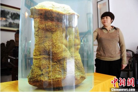 5月2日,湖南長沙烈士公園瀟湘奇石館內(nèi)一尊高76厘米、胸徑約106厘米、重52公斤的“太歲”吸引了市民的眼球。“太歲”的擁有者張淑君表示,這尊“太歲”是傳家之寶,需要千年才能長那么大,一直養(yǎng)在家里的一口大缸中,論個頭來說在全國都十分罕見。據(jù)悉,“太歲”又稱“肉靈芝”,十分稀有,是百藥中的上品。有典籍記載,“太歲”性平,苦,無毒,具有補脾潤肺,補腎益肝等價值。(來源:中新網(wǎng))