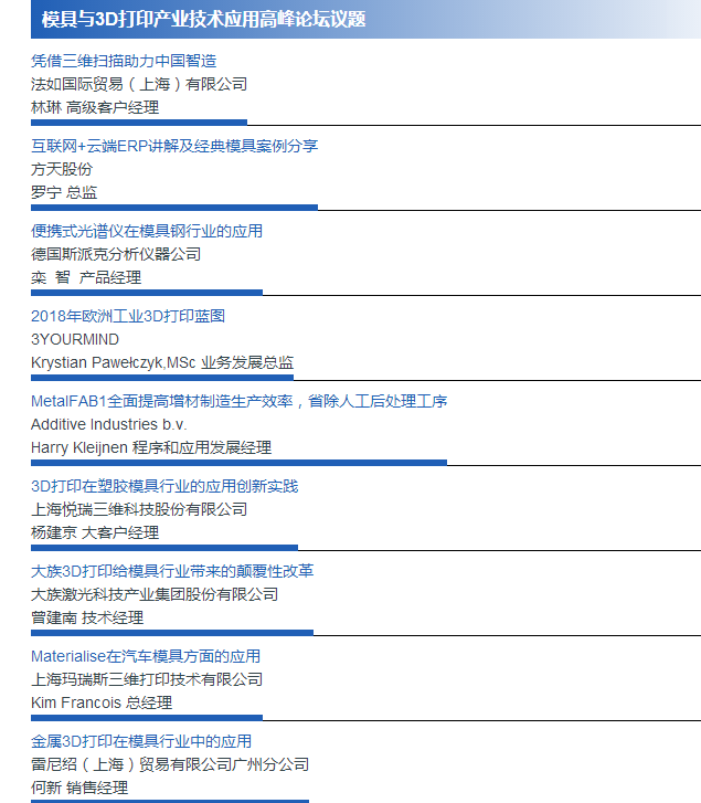 3D打印高峰論壇,由行業(yè)領(lǐng)先企業(yè)和研究機構(gòu)主講,揭示增材制造行業(yè)的應(yīng)用、發(fā)展產(chǎn)品和研究成果。不同題目匯聚環(huán)球行業(yè)智慧,擴闊業(yè)者眼界,豐富與會者的參觀體驗。論壇題目排題搶先看: