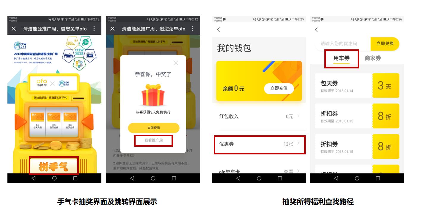 熟悉小黃車的用戶都知道,月卡和騎行券一直是ofo的固定福利模式,而全新上線的手氣卡,則將ofo的福利資源進行了全面整合。手氣卡是一個包含月卡、周卡、騎行券、折扣券等多重優(yōu)惠福利的大禮包,用戶通過老虎機搖獎即可隨機獲得不同種類的優(yōu)惠獎品。參與2018中國國際清潔能源科技推廣周與ofo小黃車聯(lián)名手氣卡的方式非常簡單,活動期內(nèi),用戶可通過推廣周官方微博、微信、EDM等平臺找到活動消息:
