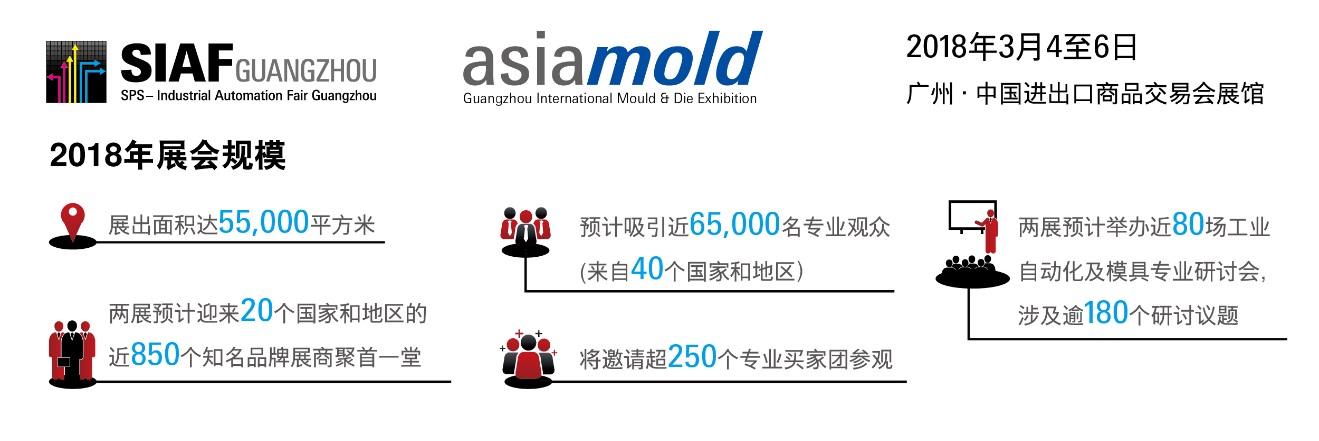 第十二屆廣州國(guó)際模具展覽會(huì)(Asiamold)將于2018年3月4-6日在廣州進(jìn)出口商品交易會(huì)展館隆重舉行,本屆展會(huì)將再次與SIAF廣州國(guó)際工業(yè)自動(dòng)化技術(shù)及裝備展覽會(huì)同期舉行,總專業(yè)觀眾人數(shù)達(dá)到65,000 名,吸引共850家展商,展覽面積占55,000平方米。