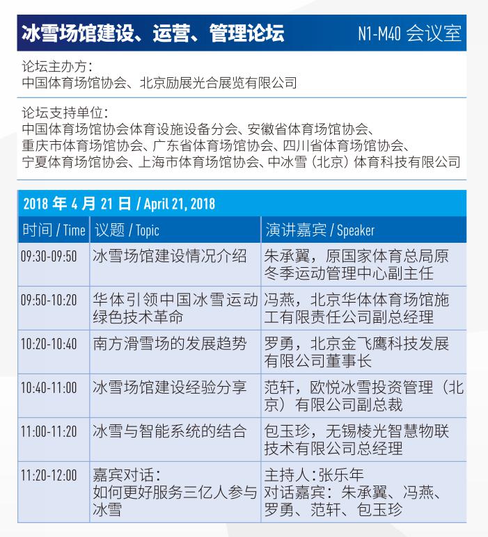 明天21日主題特色論壇“冰雪場館建設、運營、管理論壇”和“2018上海體育特色小鎮(zhèn)產業(yè)創(chuàng)新論壇”,也將分別于N1-M40會議室和館內體育場地論壇區(qū)舉辦。