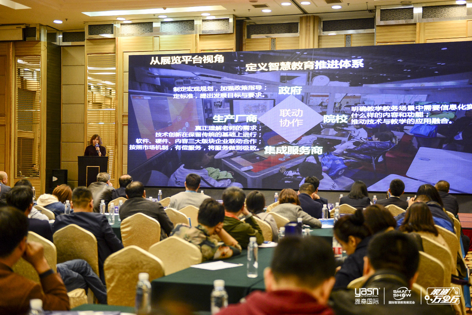 來自活動主辦方-雅森國際的何楊女士向與會的教育行業(yè)人士介紹了SmartShow智慧教育領(lǐng)袖峰會-渠道萬里行活動平臺建立的初衷—通過推動教育區(qū)域性的發(fā)展,帶動當?shù)氐脑盒!⒓缮毯蛷S商之間的三者聯(lián)動,去切實地解決當?shù)氐男枨蟆;诙嗄陙砼e辦SmartShow國際智慧教育展覽會的業(yè)界沉淀,SmartShow一直默默地從展覽平臺維度在驅(qū)動著行業(yè)發(fā)展,旨在為教育各級人士建立連通供需雙方、給企業(yè)展示新技術(shù)的聯(lián)動平臺,為智慧教育行業(yè)梳理更為全面綜合的服務體系。