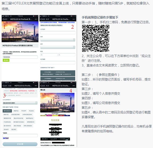 HOTELEX Beijing 2018參展預(yù)登記正火熱開(kāi)展,在此特別提醒請(qǐng)及時(shí)預(yù)登記。想了解更多展會(huì)信息,請(qǐng)微信搜索并關(guān)注公眾號(hào)“上海國(guó)際酒店及餐飲業(yè)博覽會(huì)“,了解相關(guān)信息。