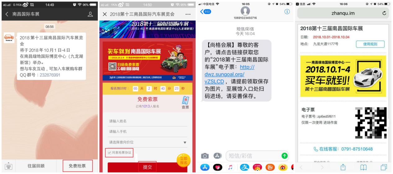 關(guān)注“南昌國際車展”微信號,點擊下方【免費搶票】進入頁面提交信息即可。官方客服電話回訪核對信息后,電子門票直接發(fā)送到您的手機上,點開鏈接查看電子票;入場前可以進入官方微信【南昌國際車展】點擊菜單【票證查詢】進入查詢頁面即可打開電子票圖片;