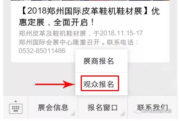 方式二:關(guān)注官方微信公眾號【鄭州鞋機鞋材展】,點擊微信公眾號底部菜單進行預(yù)登記。
