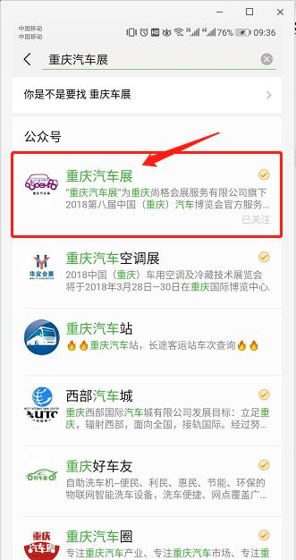 方法1:微信右上角“添加朋友”→公眾號→搜索“重慶汽車展”點擊關(guān)注即可