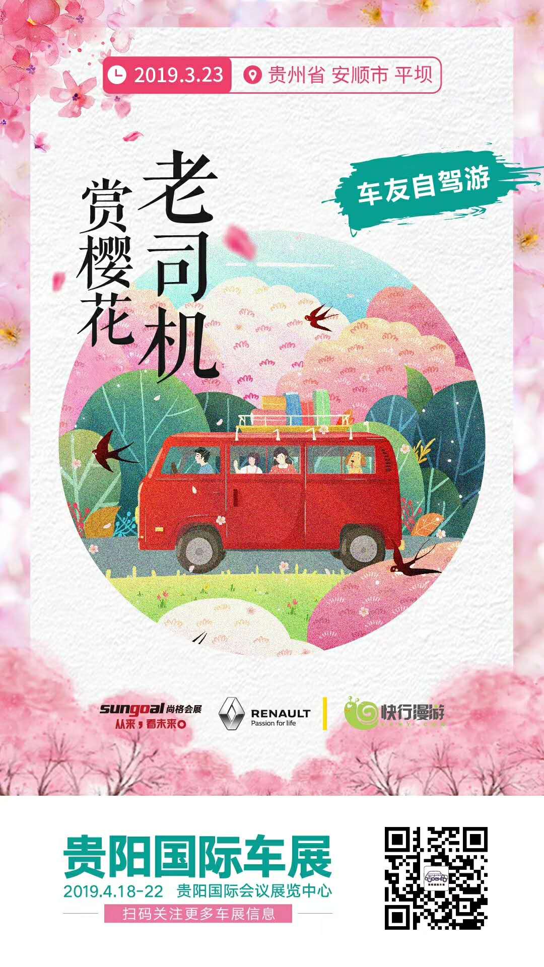 陽春三月,櫻花爛漫。2019年3月23日,2019貴陽國際車展與貴州十和田風景雷諾聯(lián)合舉辦的“老司機.賞櫻花”車友自駕游活動圓滿舉行!本期參與活動的雷諾車主正式成為“貴州365自駕車友會”首批會員,感謝所有車主和貴州黃果樹智慧旅游股份有限公司、平壩櫻花萬畝園景區(qū)和貴州風景汽車銷售服務有限公司的大力支持。預祝4月18-22日所有2019貴陽國際車展車商大賣!