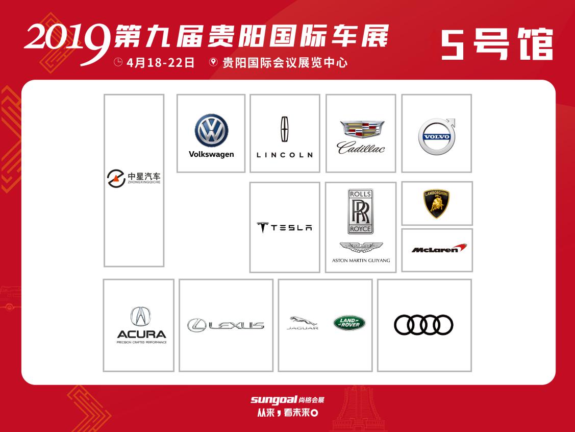 5號館(按順時針方向):中星汽車、進口大眾、林肯、凱迪拉克、沃爾沃、蘭博基尼、邁凱倫、勞斯萊斯、阿斯頓馬丁、特斯拉、奧迪、路虎、捷豹、雷克薩斯、謳歌