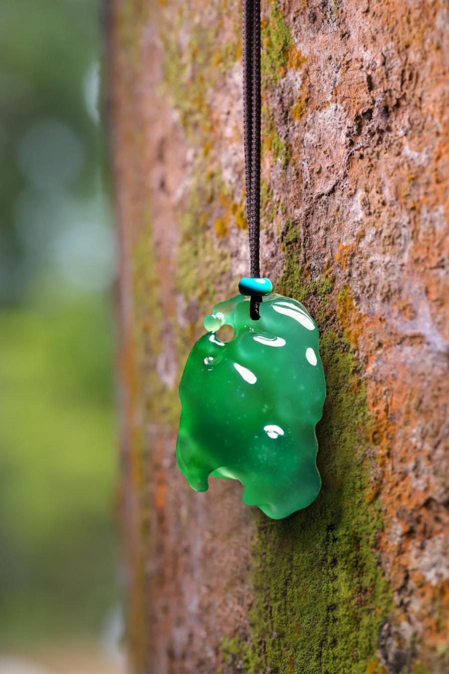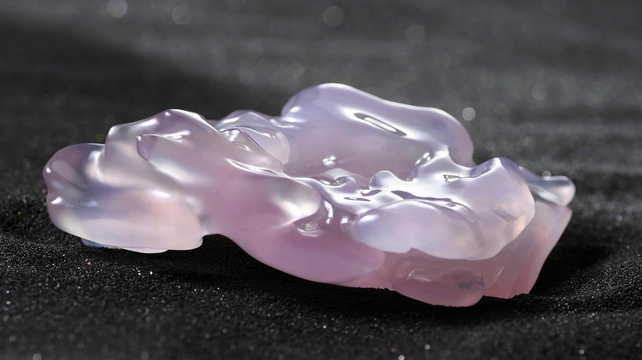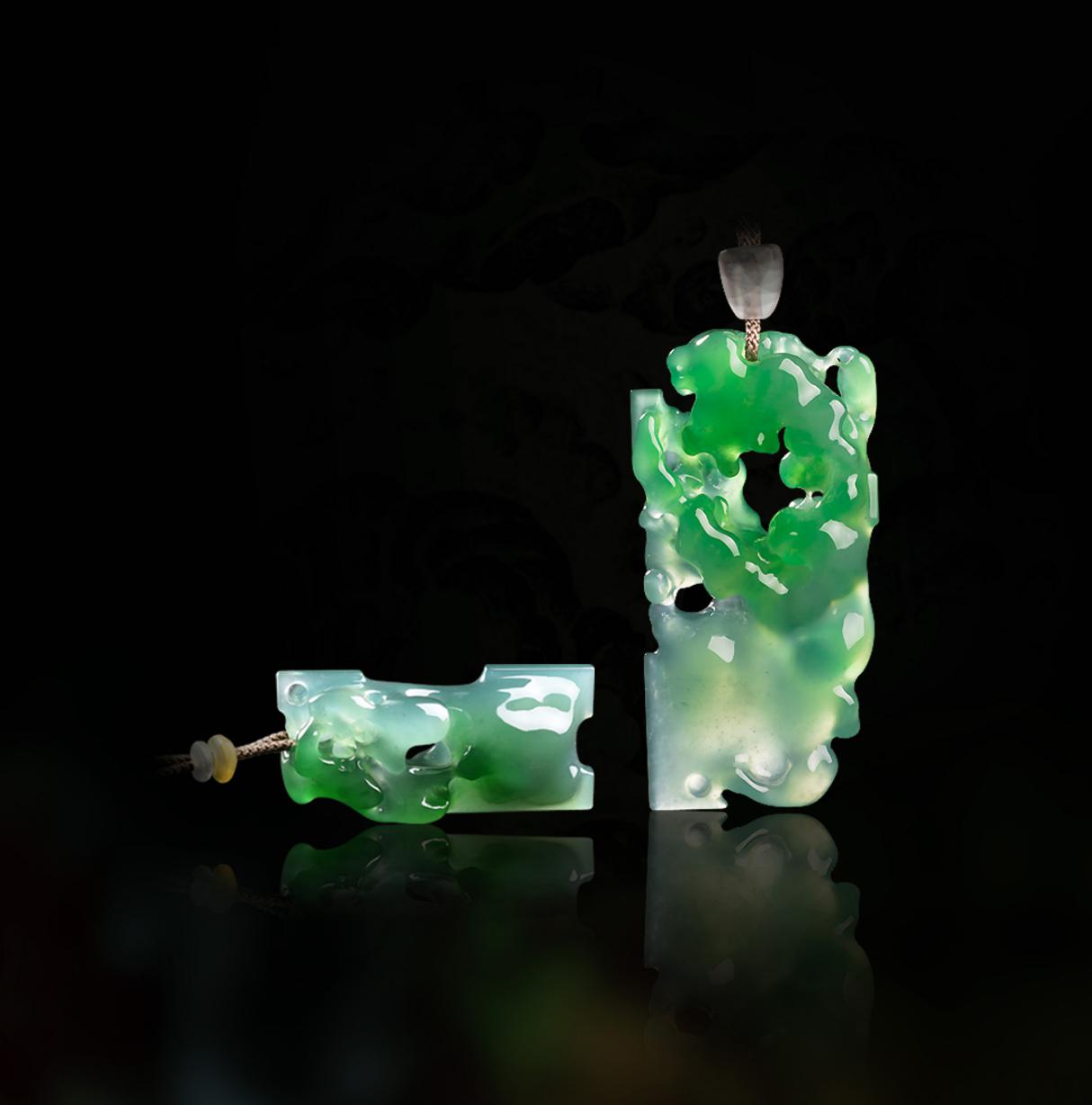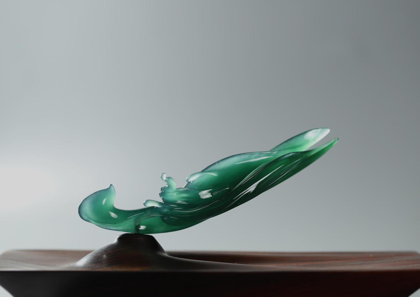 化境系列,意在還原翡翠中自然天成的美感。結(jié)合其質(zhì),形,色,意,以流暢的線條,呈現(xiàn)玉石雅致清逸,意境空明的天然之美。該系列作品造型抽象,在純凈靈透中展現(xiàn)空靈寂靜之美。在清心自由的狀態(tài)中,加以想象,感知,它或是水,是魚,是舞者,是一切生靈……成萬物之法變,應無所住而通其心,遂漸入佳境。