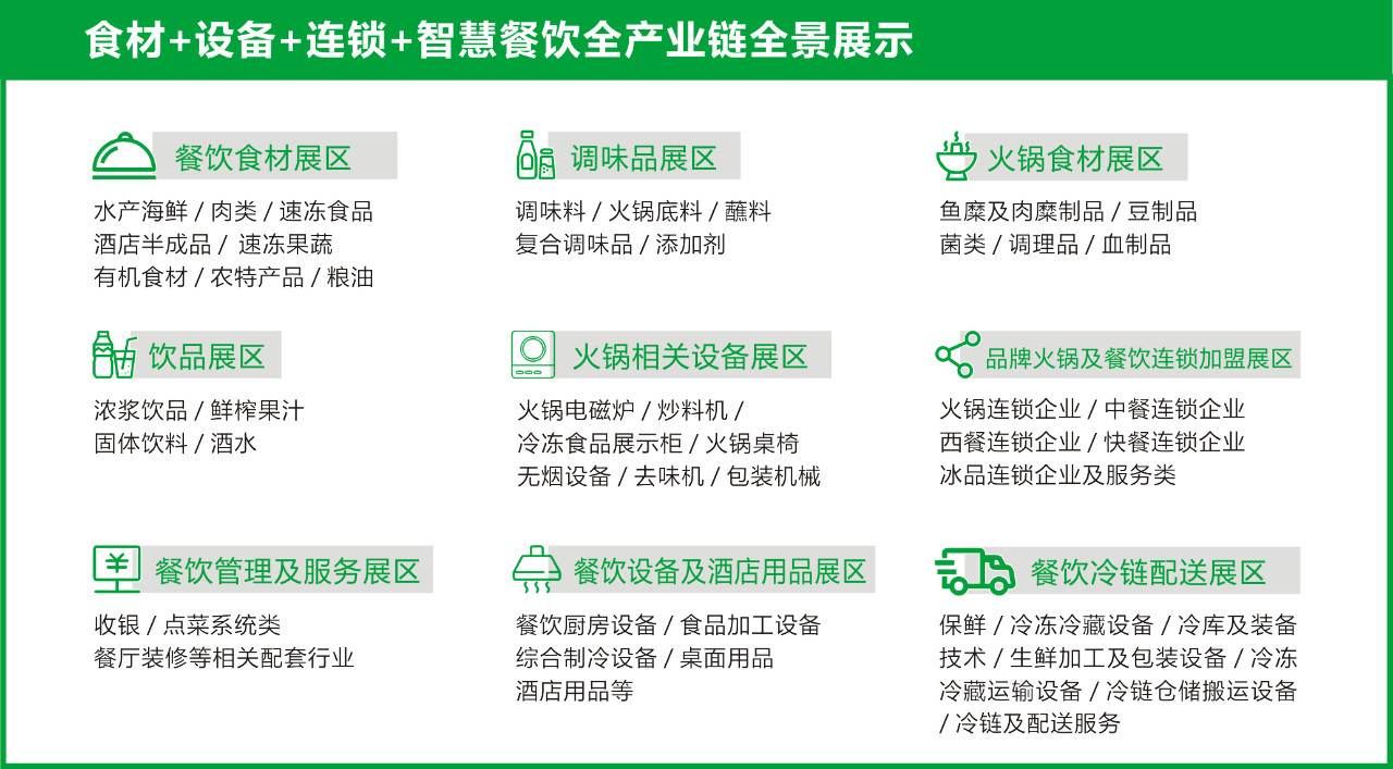 本屆展會(huì)規(guī)模升級(jí),60000㎡展示面積,設(shè)置5大展館,9大展區(qū),2000多家參展企業(yè),展示餐飲食材、調(diào)味品、火鍋食材及用品、餐飲設(shè)備及酒店用品、咖啡飲品、連鎖加盟、冷鏈物流等相關(guān)的萬(wàn)款產(chǎn)品。同時(shí)特設(shè)餐飲冷鏈配送展區(qū)、餐飲食材加工與包裝展區(qū)。展區(qū)主題不斷豐富,展品覆蓋餐飲全產(chǎn)業(yè)鏈。