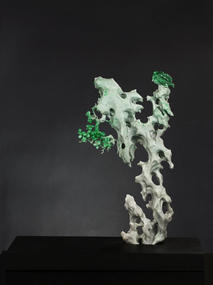 以《一樹清風(fēng)》為例看玉雕大師如何俏色巧用,作品原料為翡翠,顏色主要以不同色調(diào)的綠色為主,作品選材自然主題,巧用原料中的深綠色部分做樹木及臥鳥,其余部分做怪石狀。著重刻畫樹葉、根莖、羽毛、怪石走向等細(xì)節(jié),用顏色濃淡表現(xiàn)前后關(guān)系,凸顯立體感和真實(shí)感,以刻刀為筆,“繪制”出一副頗具國(guó)風(fēng)的工筆畫。