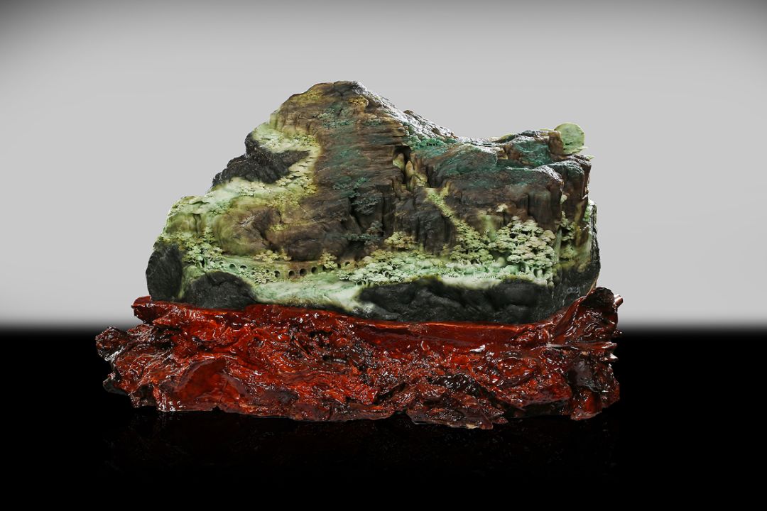 作品《巍巍太行》材質(zhì)為獨(dú)山玉,作品靈感源于自然山林。此原料為雜色獨(dú)山玉,綠、白、褐、青等顏色相互呈浸染狀或漸變過(guò)渡狀存在于同一塊體上,其塊度大,形狀似山峰。作者以此為基礎(chǔ),用巧奪天工的高超技藝雕刻出太行山勝景。借用中國(guó)山水畫中散點(diǎn)透視,高遠(yuǎn)、深遠(yuǎn)、平遠(yuǎn)的“三遠(yuǎn)”表現(xiàn)手法,巧用顏色體現(xiàn)前后關(guān)系以及畫面立體感。近處的樹林、橋梁、牛群、流水;遠(yuǎn)處的庭閣、房屋、小路、云彩,以淺色表現(xiàn),比例適當(dāng)、線條流暢、細(xì)節(jié)處理到位傳神,能抓住觀者第一視角。以褐、棕色表現(xiàn)山脈,突顯山脈的陡峭層疊、莊重巍峨之感,太行山的大氣磅礴與山中生活意境之美完美呈現(xiàn)。