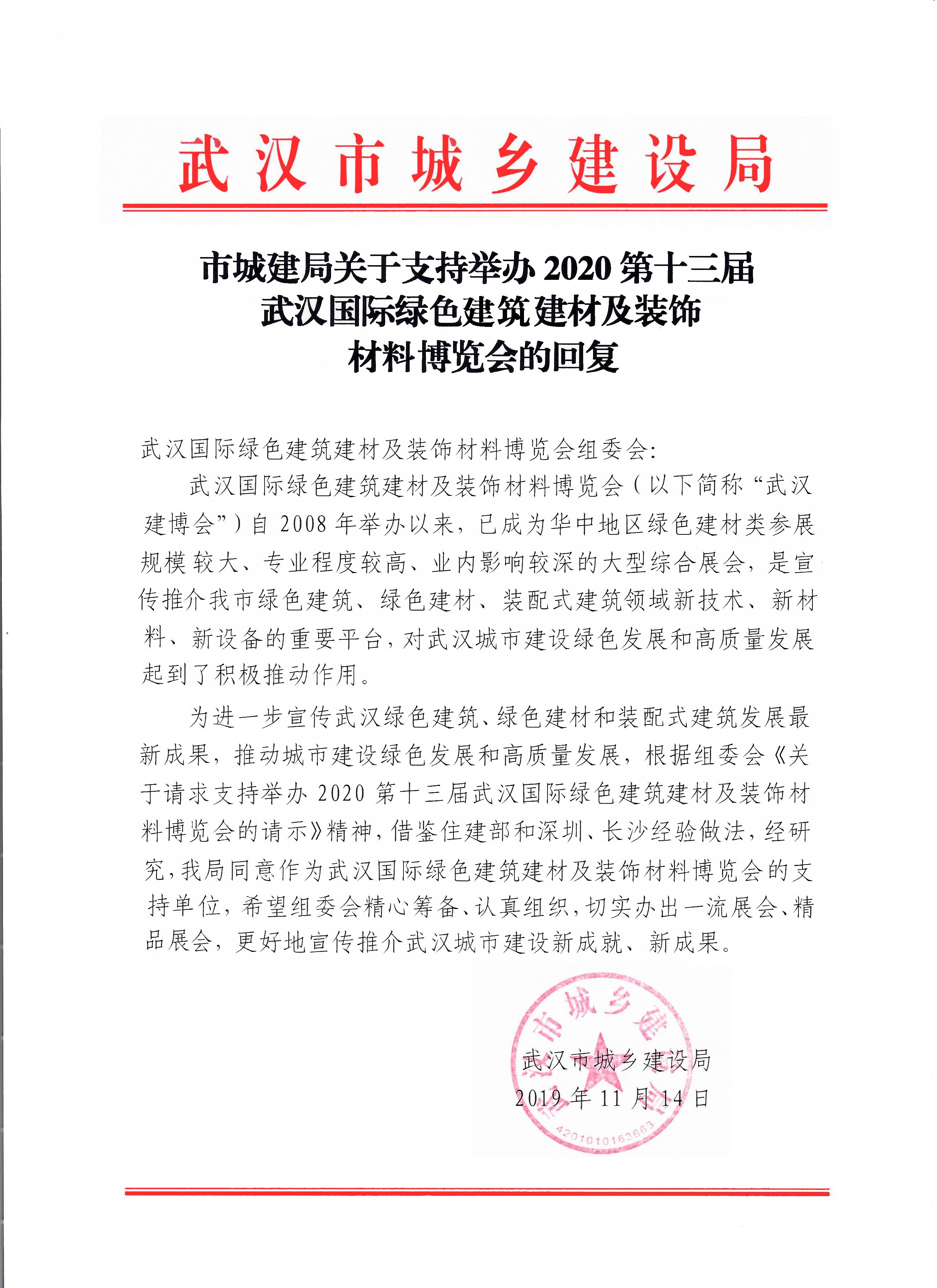日前,武漢市城建局做出決定,全力支持2020第十三屆武漢國際綠色建筑建材及裝飾材料博覽會(簡稱:武漢建博會)做大做強,并下文回復(fù),強調(diào)要切實辦出一流展會、精品展會,更好宣傳推介武漢城市建設(shè)新成就、新成果。
