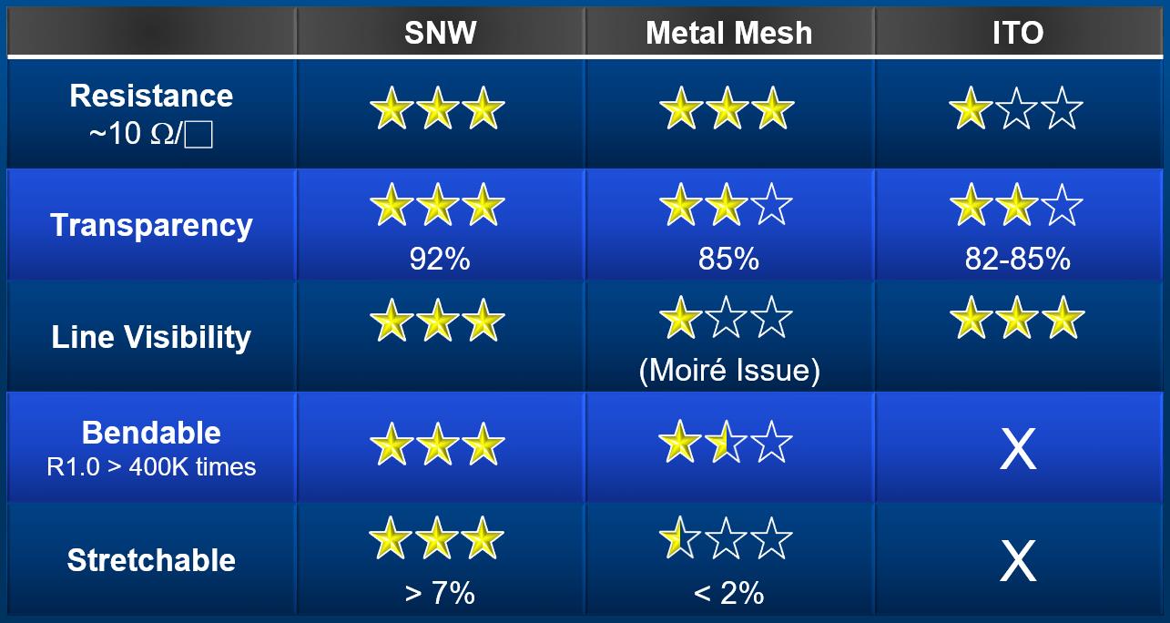 江博士表示,之所以選擇納米銀線,也是多方考慮后選擇的結(jié)果。因為納米銀線相對于其他柔性觸控材料、如金屬網(wǎng)格、石墨烯等材料,其性能的優(yōu)越性更為全面。