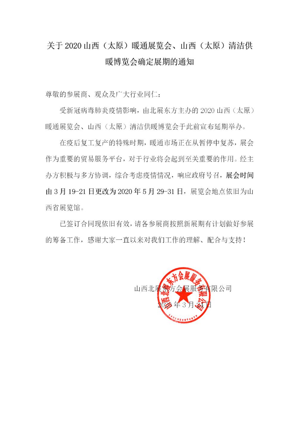 根據(jù)新型肺炎疫情防控需要,為貫徹落實(shí)黨中央和山西省政府做好新型冠狀病毒感染的肺炎疫情防控工作,切實(shí)保障廣大參展商和觀眾及各界朋友們的健康安全,確保參展企業(yè)的參展效果和采購商的參觀體驗(yàn),原定于3月19-21日在山西舉辦的2020山西(太原)暖通展覽會延期至5月29-31日舉辦。