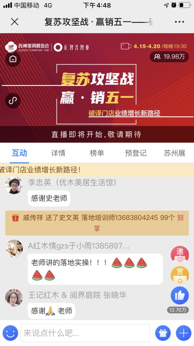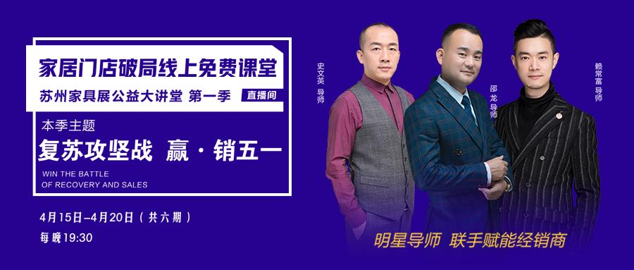 為幫助家具人破局突圍,蘇州家具展調(diào)動得一集團資源啟動【復(fù)蘇攻堅戰(zhàn)贏·銷五一】的暖春行動公益直播,賦能家具門店。4月15-20日每晚7點半,三位家具行業(yè)重量級講師在線開播,累計20萬人次觀看,抓重點解難題,對當下家具線下門店經(jīng)營痛點進行了深入細致的解析。