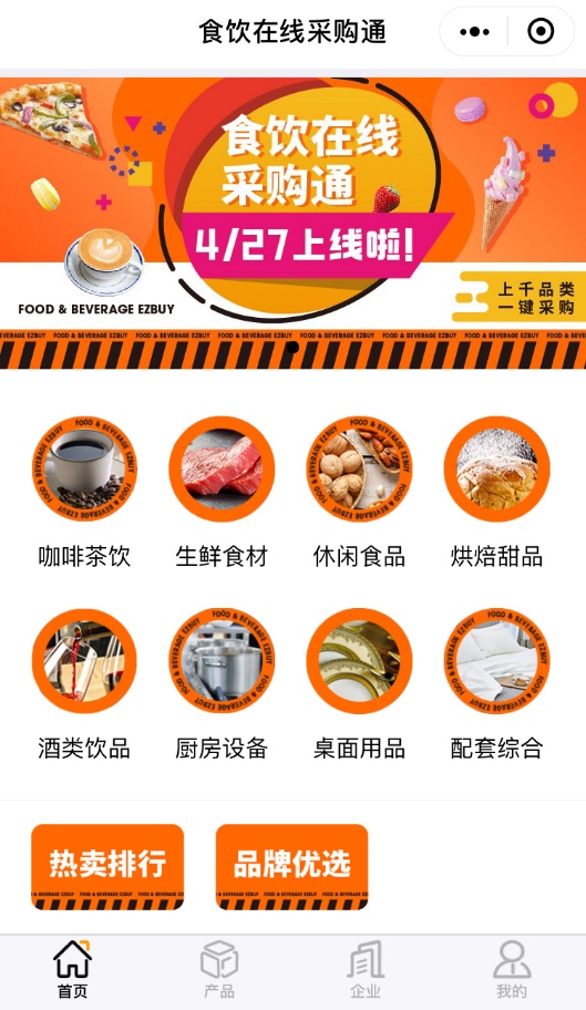 “食飲在線采購?fù)?rdquo;覆蓋餐飲行業(yè)中的八大品類,包括咖啡茶飲、生鮮食材、休閑食品、烘焙甜品、酒類飲品、廚房設(shè)備、桌面用品及配套綜合,從食材、飲料,到配套設(shè)備,一應(yīng)俱全,一個平臺滿足餐飲人所有需求。