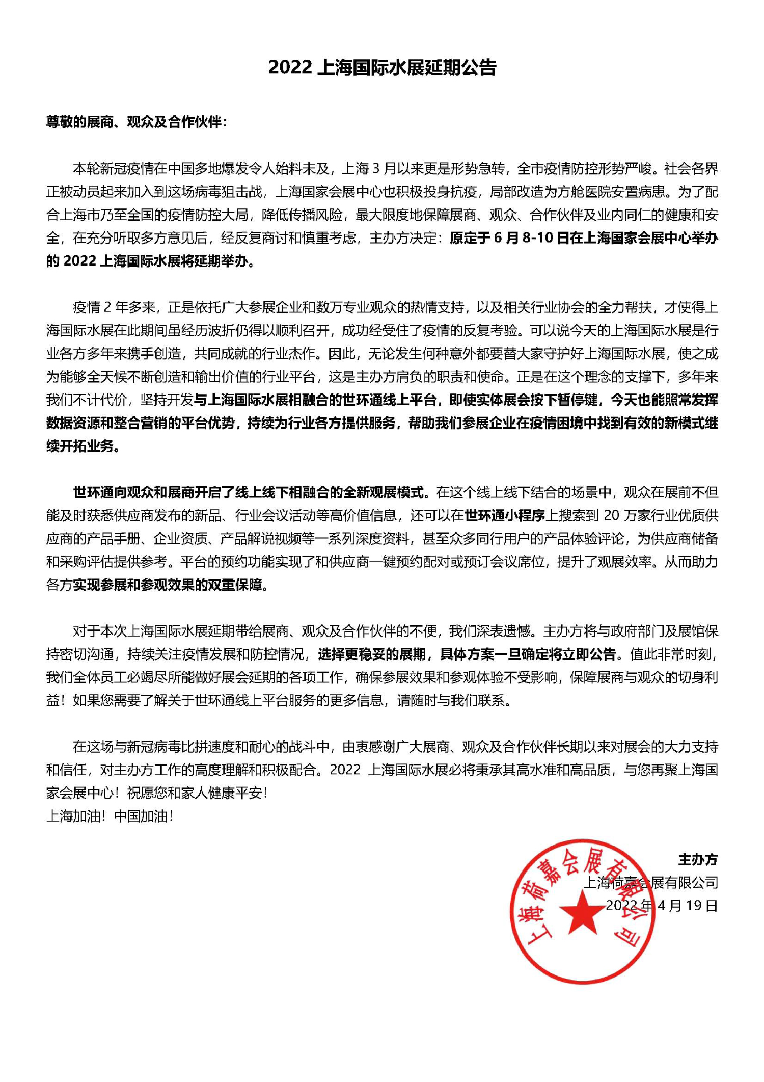 為了配合上海市乃至全國(guó)的疫情防控大局,降低傳播風(fēng)險(xiǎn),最大限度地保障展商、觀眾、合作伙伴及業(yè)內(nèi)同仁的健康和安全,在充分聽(tīng)取多方意見(jiàn)后,經(jīng)反復(fù)商討和慎重考慮,主辦方?jīng)Q定:原定于68-10日在上海國(guó)家會(huì)展中心舉辦的2022上海國(guó)際水展將延期舉辦。