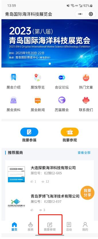 點(diǎn)擊展商秀底邊欄中央的【我要參會(huì)】按鈕,直接報(bào)名參加青島??普?,避免現(xiàn)場登記注冊(cè)麻煩。提前預(yù)登記的觀眾還可以享有免費(fèi)午餐等展會(huì)特權(quán)!