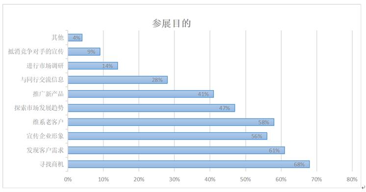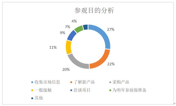 專業(yè)觀眾的參觀目的有“收集市場(chǎng)信息”“了解新產(chǎn)品”“采購(gòu)產(chǎn)品” “一般接觸”“洽談項(xiàng)目”“為明年參展做準(zhǔn)備”,比重依次降低。